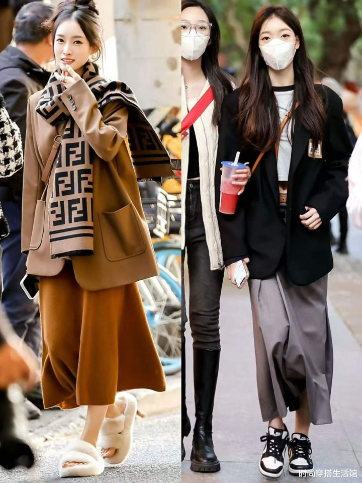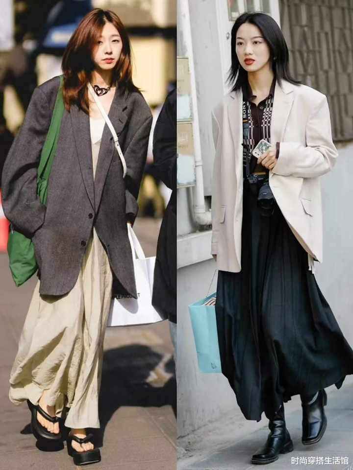 入秋后早晚温差比较大,那么我们该如何兼顾风度和温度呢?最正确的打开方式就是选择西装和裙子的搭配,轻松就可以解决这个搭配难题。像是白天温度比较高的时候,我们可以选择脱下西装,露出内搭,晚上温度下降就穿上西装,从而起到了防风和保暖的作用,同时还能让我们塑造出多种多样的搭配方式。